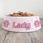 Our Personalised Dog Bowls are the ultimate dinner accessory for your pet.  PAWfect for Dogs, Cats, Llamas, Penguins, Giraffes or any pet that you just happen to have, our melamine pet bowls make the perfect addition to any home. A stainless steel bowl insert for our Personalised Dog Bowls for water is also available (Large Bowl Only) as an extra add on.